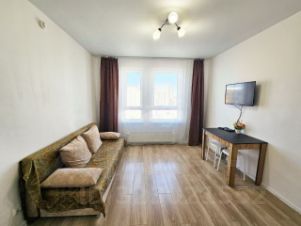 Квартира-студия с современным ремонтом расположена в жилом комплексе "Черноморский 2" в Южном районе Новороссийска. Ремонт выполнен в нейтральных тонах с качественной отделкой — ламинат, натяжные потолки, керамическая плитка в санузле. В помещении установлена функциональная мебель (диван-кровать, шкаф-купе, кухонный гарнитур) и необходимая техника (холодильник, кондиционер, стиральная машина). Главное преимущество — окна с видом на море и благоустроенный двор с зелеными насаждениями.
