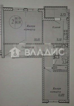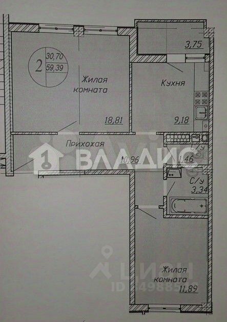 - Общая площадь: 59,4 кв. м.