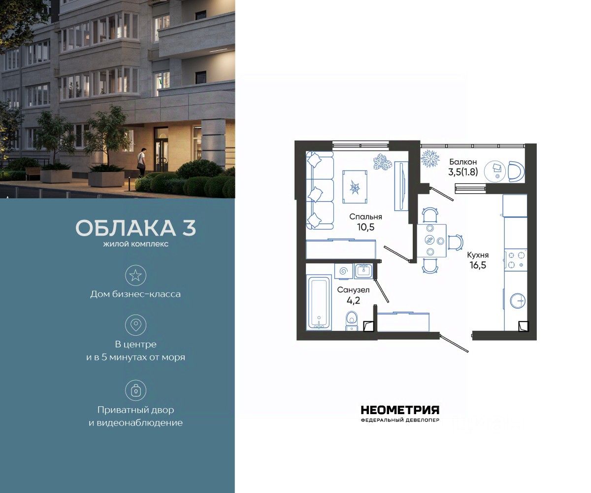 Продается квартира в жилом комплексе "Облака" от федерального девелопера "Неометрия". Современный жилой комплекс расположен на границе Южного и Центрального районов Новороссийска — в развитой, благоустроенной локации всего в 5 минутах езды от моря и центра города. Здесь мягкий климат, чистый воздух и гармоничное сочетание природы и городской инфраструктуры. Всё для комфортной жизни: • Закрытая дворовая территория без машин; • Подземный паркинг с доступом на лифте; • Колясочные в каждом подъезде; • Сквозные входные группы на уровне земли; • Просторные квартиры с видами на горы и море. Современное благоустройство: Во дворах реализована концепция "активити-парка" — это большое зелёное пространство для отдыха и занятий спортом: • Детские площадки, разделенные по возрасту ребенка; • Зоны воркаута, йоги и командных игр, внесенные за периметр двора; • Озеленённые аллеи и уютные места для прогулок; • Общественные огороды для семейного досуга. Развитая инфраструктура в шаговой доступности: • 5 детских садов; • 3 школы; • 5 высших учебных заведений; • 2 поликлиники; • 2 крупных торговых центра; • Супермаркеты и магазины; • Удобные остановки общественного транспорта. Застройка ведётся по 214-ФЗ с использованием эскроу-счетов, что обеспечивает безопасность сделки и прозрачность на всех этапах. • 3 очередь проекта — сдача в IV квартале 2026 года, класс бизнес • 2 очередь — сдана в 2024 г., класс комфорт-плюс • 1 очередь — сдана в 2020 г., класс комфорт-плюс