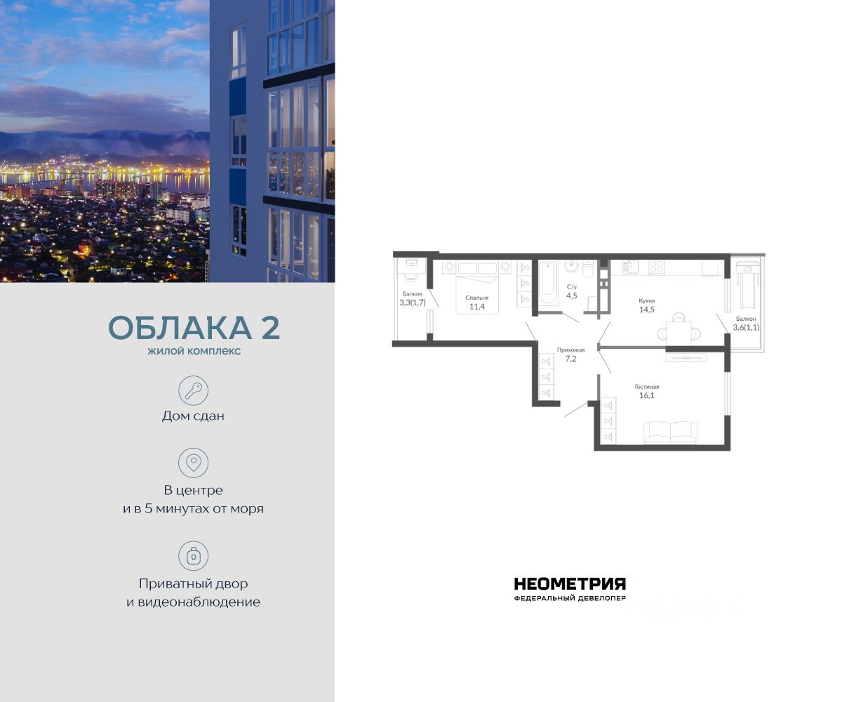 Продается квартира в жилом комплексе "Облака" от федерального девелопера "Неометрия". Современный жилой комплекс расположен на границе Южного и Центрального районов Новороссийска — в развитой, благоустроенной локации всего в 5 минутах езды от моря и центра города. Здесь мягкий климат, чистый воздух и гармоничное сочетание природы и городской инфраструктуры. Всё для комфортной жизни: • Закрытая дворовая территория без машин; • Подземный паркинг с доступом на лифте; • Колясочные в каждом подъезде; • Сквозные входные группы на уровне земли; • Просторные квартиры с видами на горы и море. Современное благоустройство: Во дворах реализована концепция "активити-парка" — это большое зелёное пространство для отдыха и занятий спортом: • Детские площадки, разделенные по возрасту ребенка; • Зоны воркаута, йоги и командных игр, внесенные за периметр двора; • Озеленённые аллеи и уютные места для прогулок; • Общественные огороды для семейного досуга. Развитая инфраструктура в шаговой доступности: • 5 детских садов; • 3 школы; • 5 высших учебных заведений; • 2 поликлиники; • 2 крупных торговых центра; • Супермаркеты и магазины; • Удобные остановки общественного транспорта. Застройка ведётся по 214-ФЗ с использованием эскроу-счетов, что обеспечивает безопасность сделки и прозрачность на всех этапах. • 3 очередь проекта — сдача в IV квартале 2026 года, класс бизнес • 2 очередь — сдана в 2024 г., класс комфорт-плюс • 1 очередь — сдана в 2020 г., класс комфорт-плюс