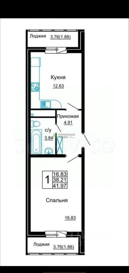 Общая площадь - 41,97 кв.м