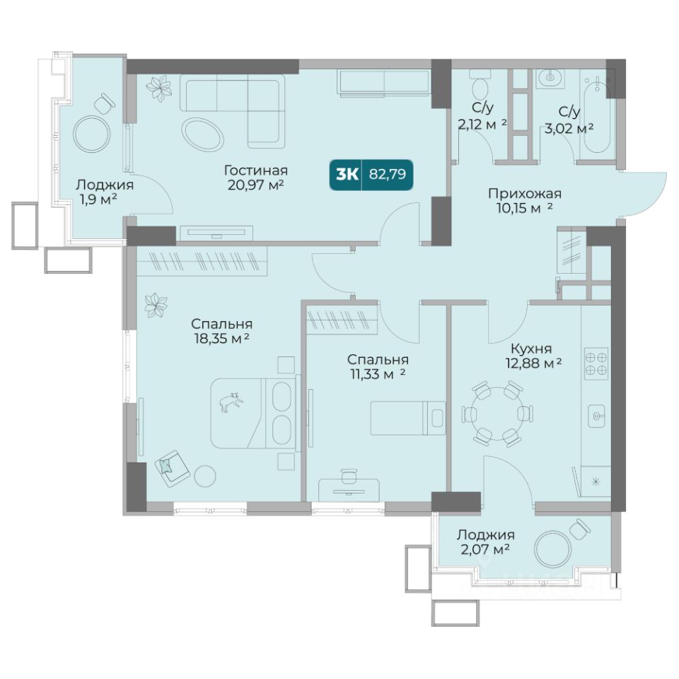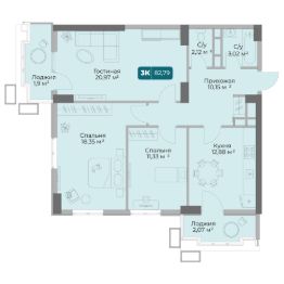 Уникальная 3-комнатная Квартира 55 площадью 82,79 кв.м. в ЖК "Золотой Берег" — 800 метров или 10 минут до моря, современный дизайн и все условия для комфортной жизни!