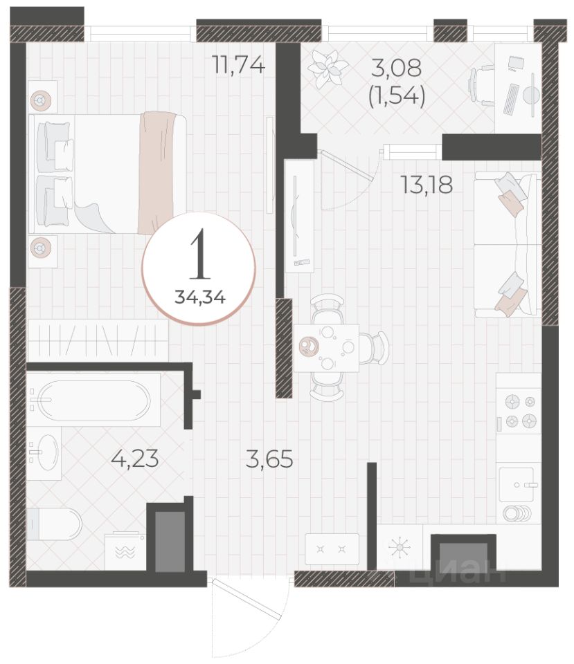 Общая площадь34,34 м²