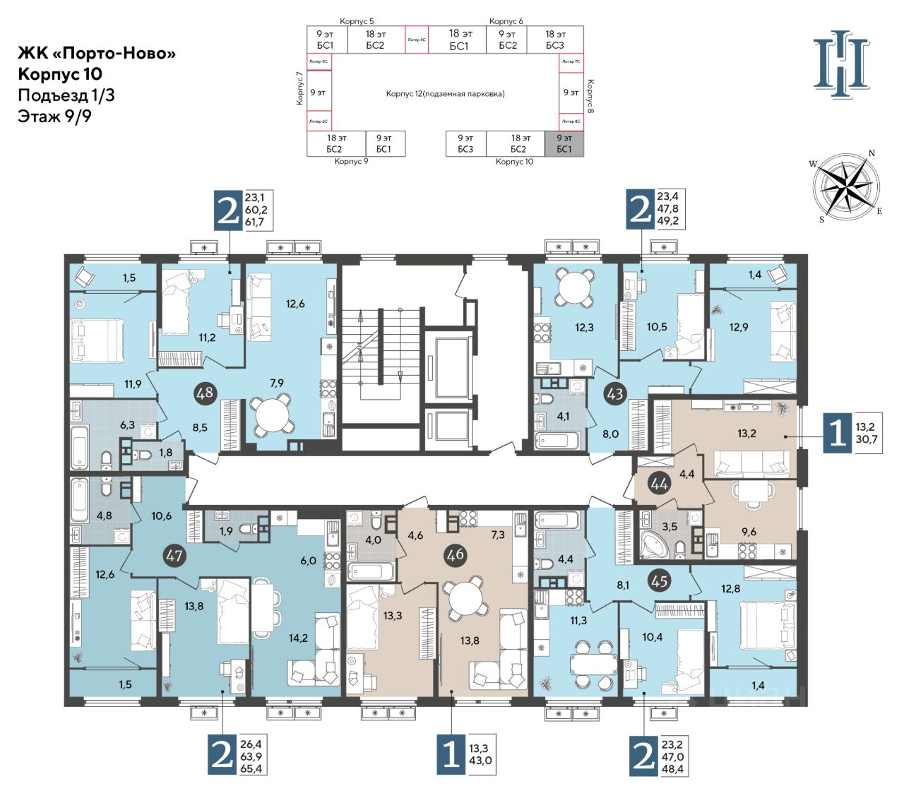 Срок сдачи: 1 кв. 2027, общей площадью 65.4 кв.м., на 9 этаже.