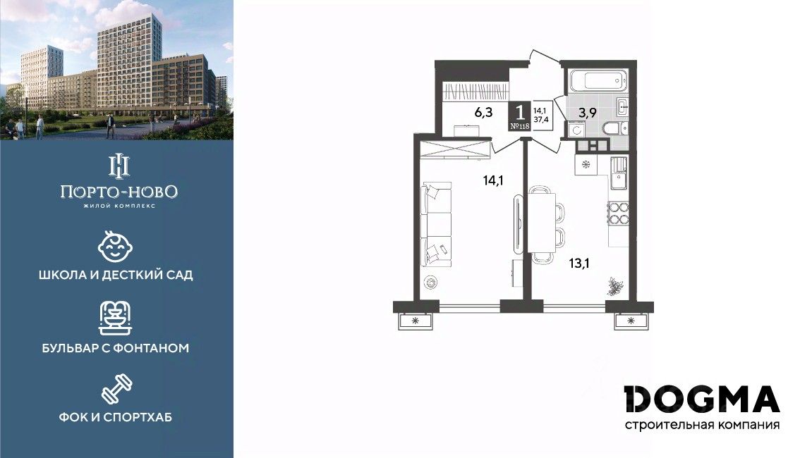 Срок сдачи: 1 кв. 2027, общей площадью 37.4 кв.м., на 8 этаже.
