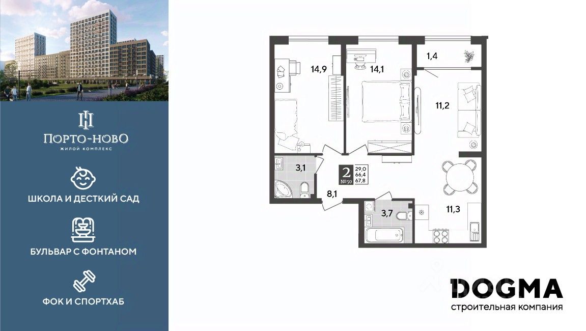 Срок сдачи: 1 кв. 2027, общей площадью 67.8 кв.м., на 2 этаже.