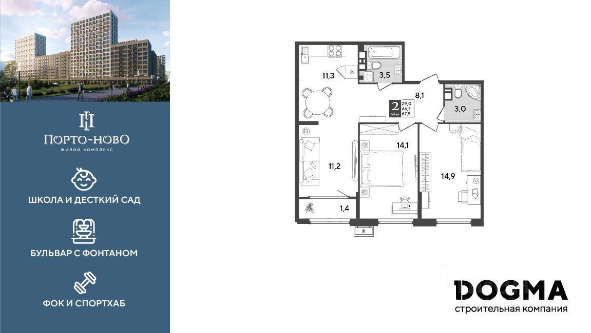 Срок сдачи: 1 кв. 2027, общей площадью 67.5 кв.м., на 8 этаже.