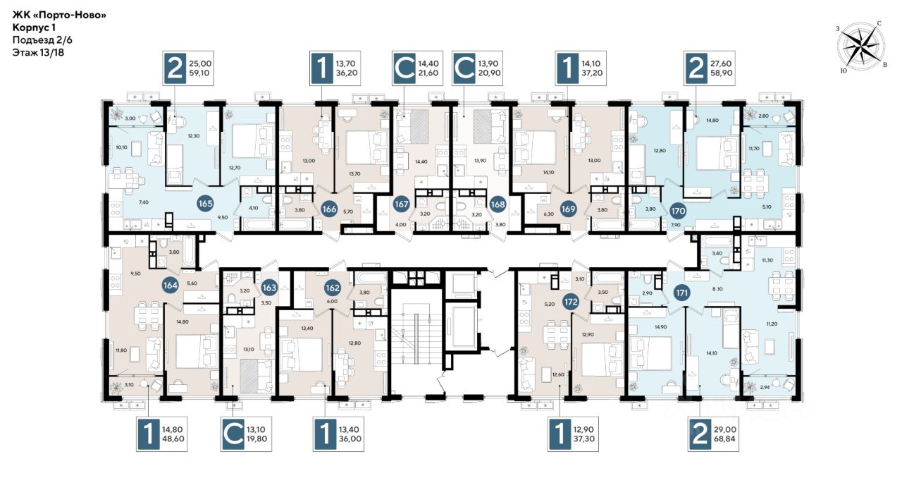 Срок сдачи: 1 кв. 2027, общей площадью 37.2 кв.м., на 13 этаже.