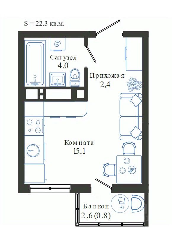Общая площадь22,3 м²