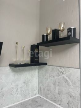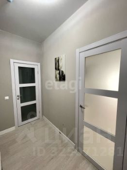 Студия выполнена в светлых тонах, что визуально увеличивает пространство и создаёт ощущение простора. В квартире установлен встроенный кухонный гарнитур с необходимой бытовой техникой, диван, шкаф-купе . Санузел оборудован
