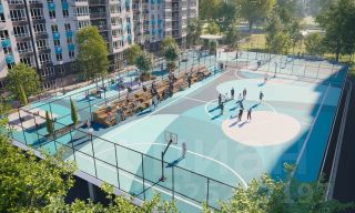 Во дворах реализована концепция "активити-парка" — это большое зелёное пространство для отдыха и занятий спортом: