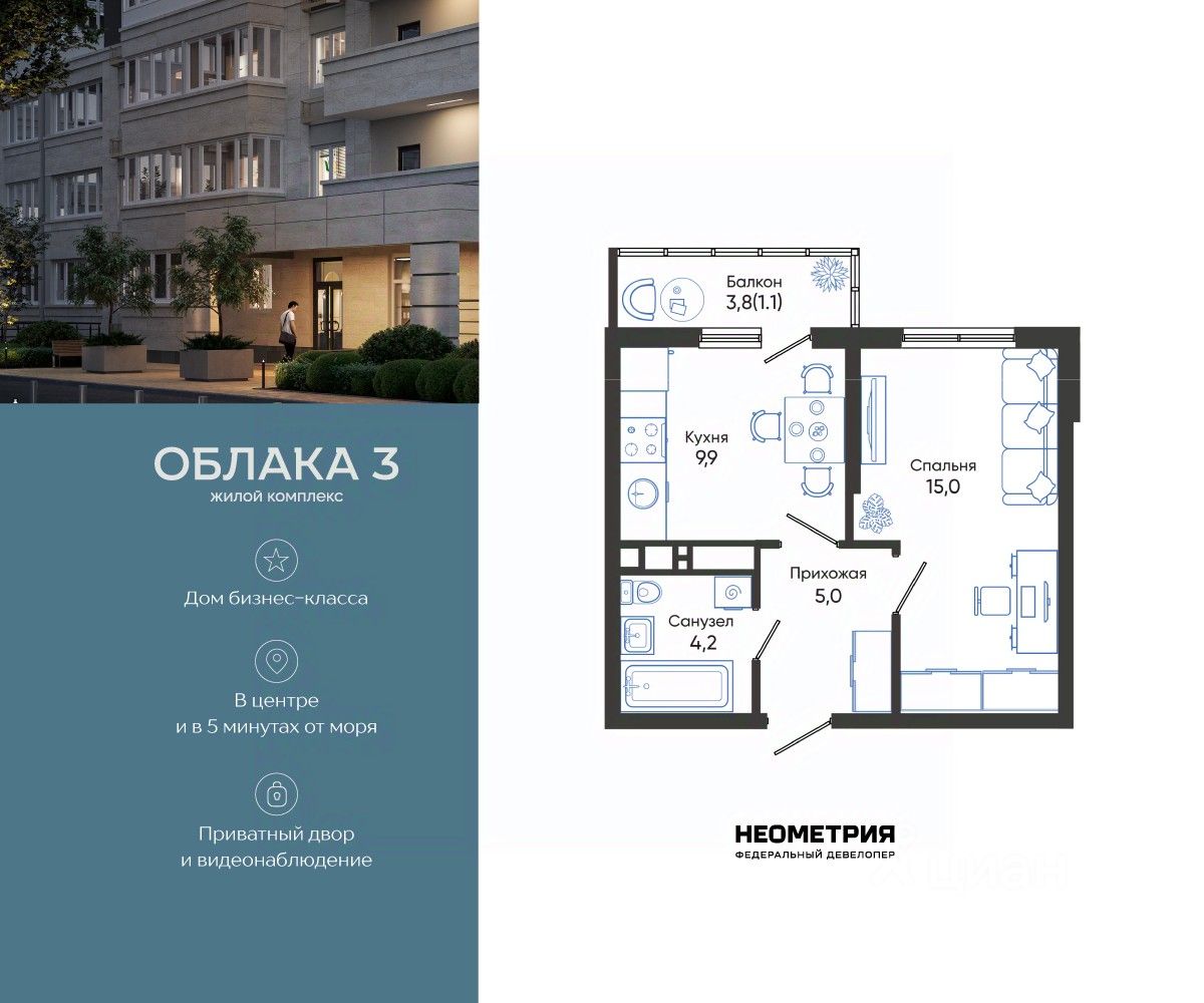 Продается квартира в жилом комплексе "Облака" от федерального девелопера "Неометрия".