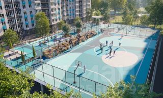 Во дворах реализована концепция "активити-парка" — это большое зелёное пространство для отдыха и занятий спортом: