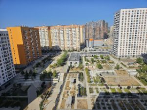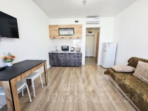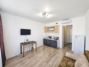 Квартира-студия с современным ремонтом расположена в жилом комплексе "Черноморский 2" в Южном районе Новороссийска. Ремонт выполнен в нейтральных тонах с качественной отделкой — ламинат, натяжные потолки, керамическая плитка в санузле. В помещении установлена функциональная мебель (диван-кровать, шкаф-купе, кухонный гарнитур) и необходимая техника (холодильник, кондиционер, стиральная машина). Главное преимущество — окна с видом на море и благоустроенный двор с зелеными насаждениями.
