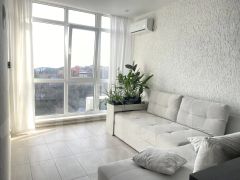 Продается просторная двухкомнатная квартира с евро-ремонтом на 9 этаже монолитного дома .Из панарамных окон открывается потрясающий вид на море и город.