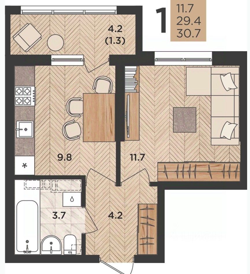 Общая площадь квартиры составляет 30.7 кв. м.