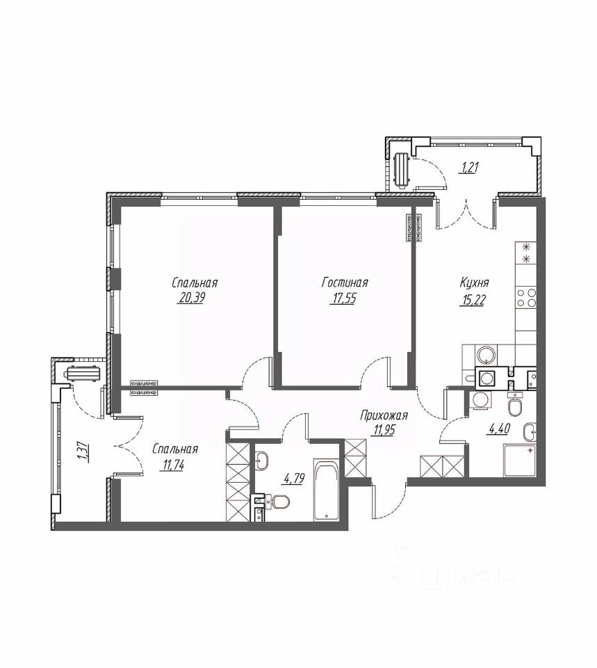 - Две спальни 12,0 и 17.55 кв.м