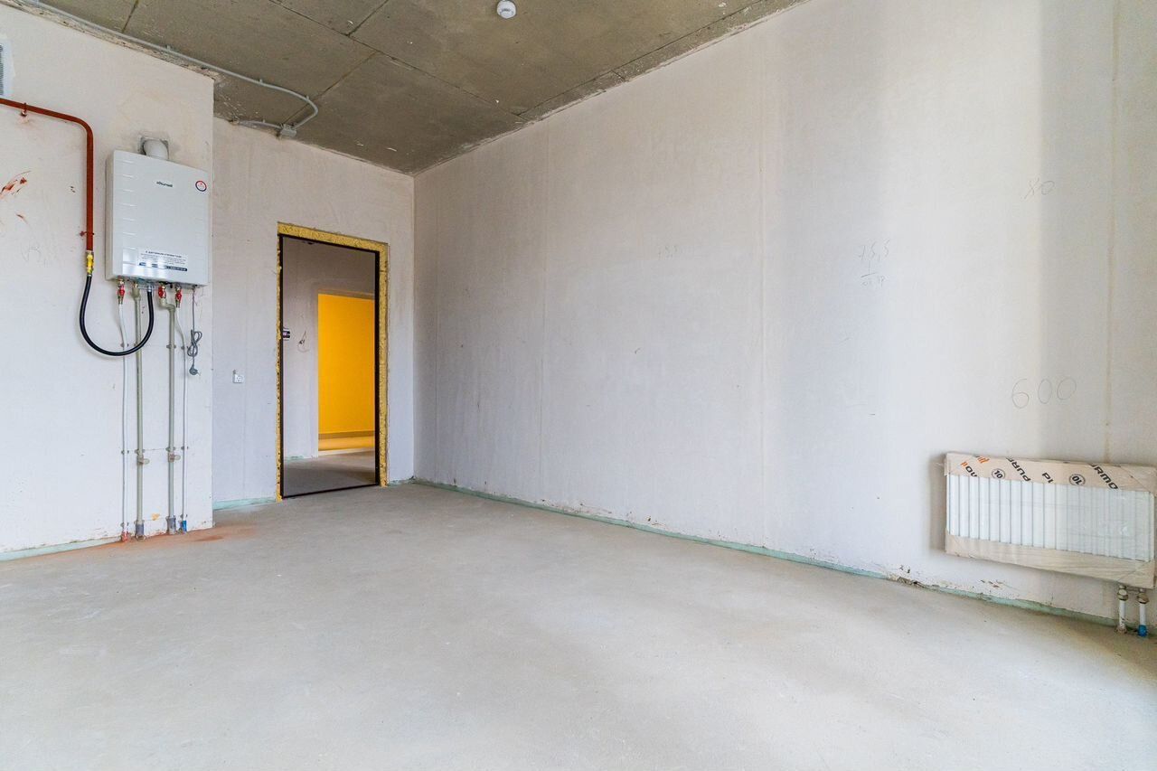 Квартира сдается в предчистовой отделке: выполнена стяжка полка, оштукатуривание стен, установлен двух-контурный газовый котел с разводкой до радиаторов отопления.