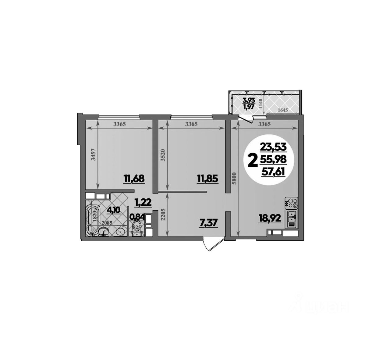 Общая площадь57,61 м²