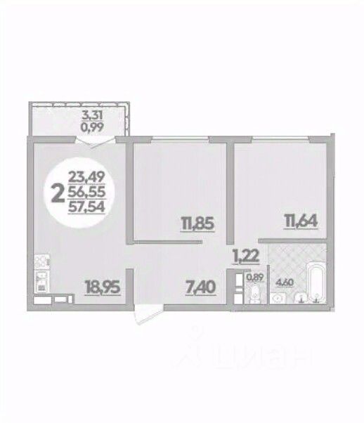 Общая площадь57,54 м²