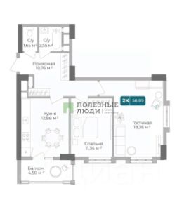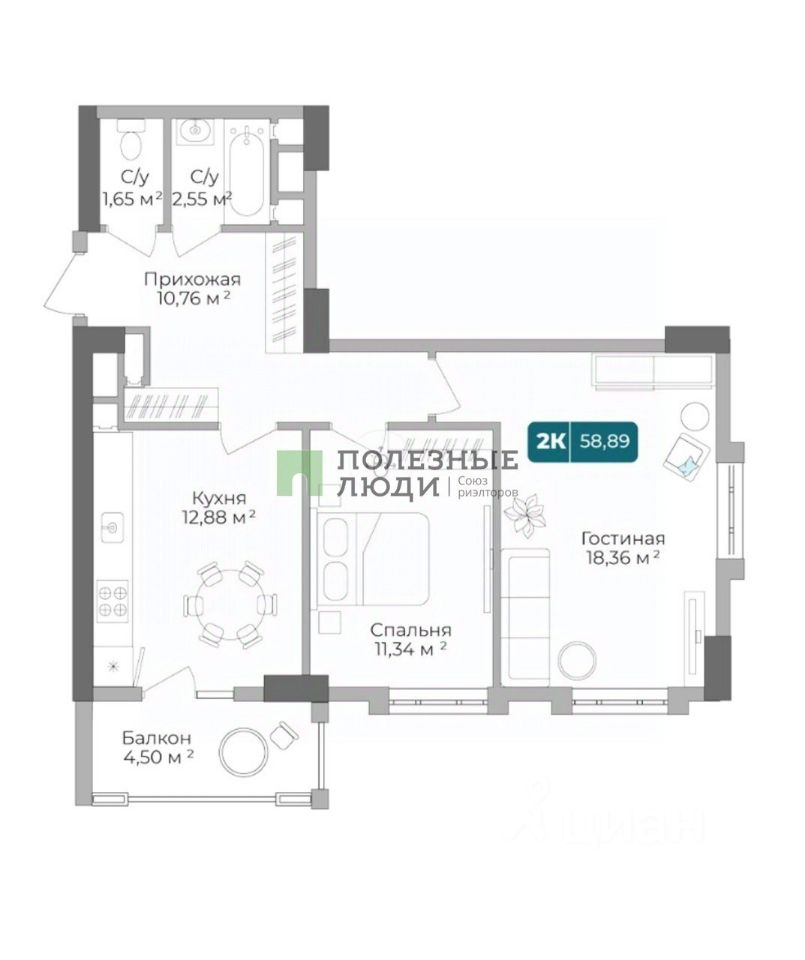 Уникальная 2-комнатная Квартира 89 площадью 58,55 кв.м. в ЖК "Золотой Берег" — 800 метров или 10 минут до моря, современный дизайн и все условия для комфортной жизни!