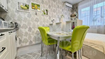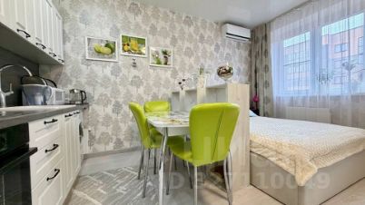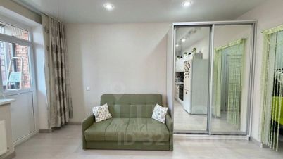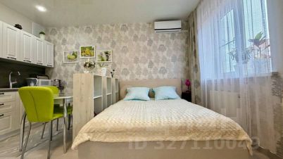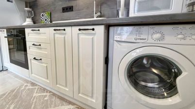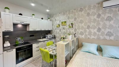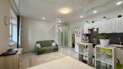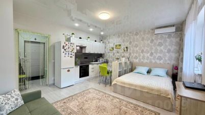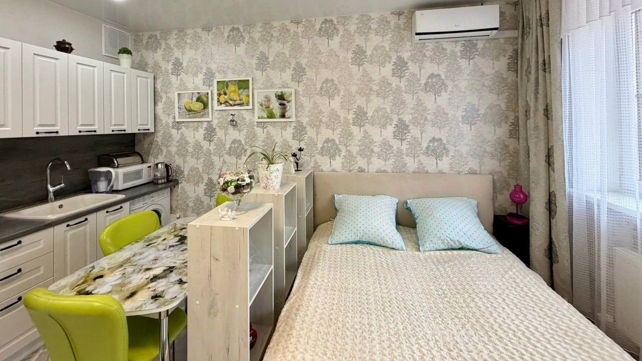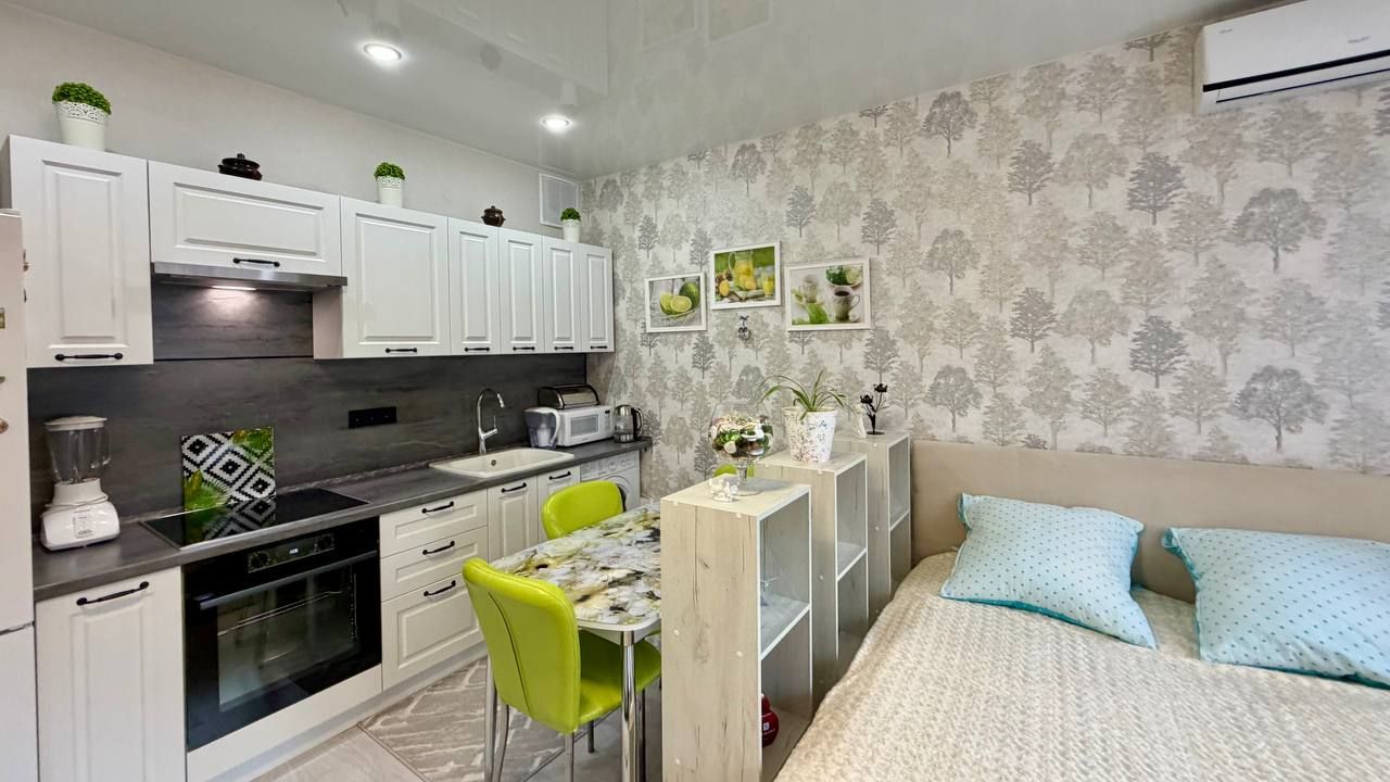 В студии выполнен ремонт в спокойных тонах. Установлен кухонный гарнитур с варочной поверхностью и духовкой, стиральная машинка, сплит система, холодильник.