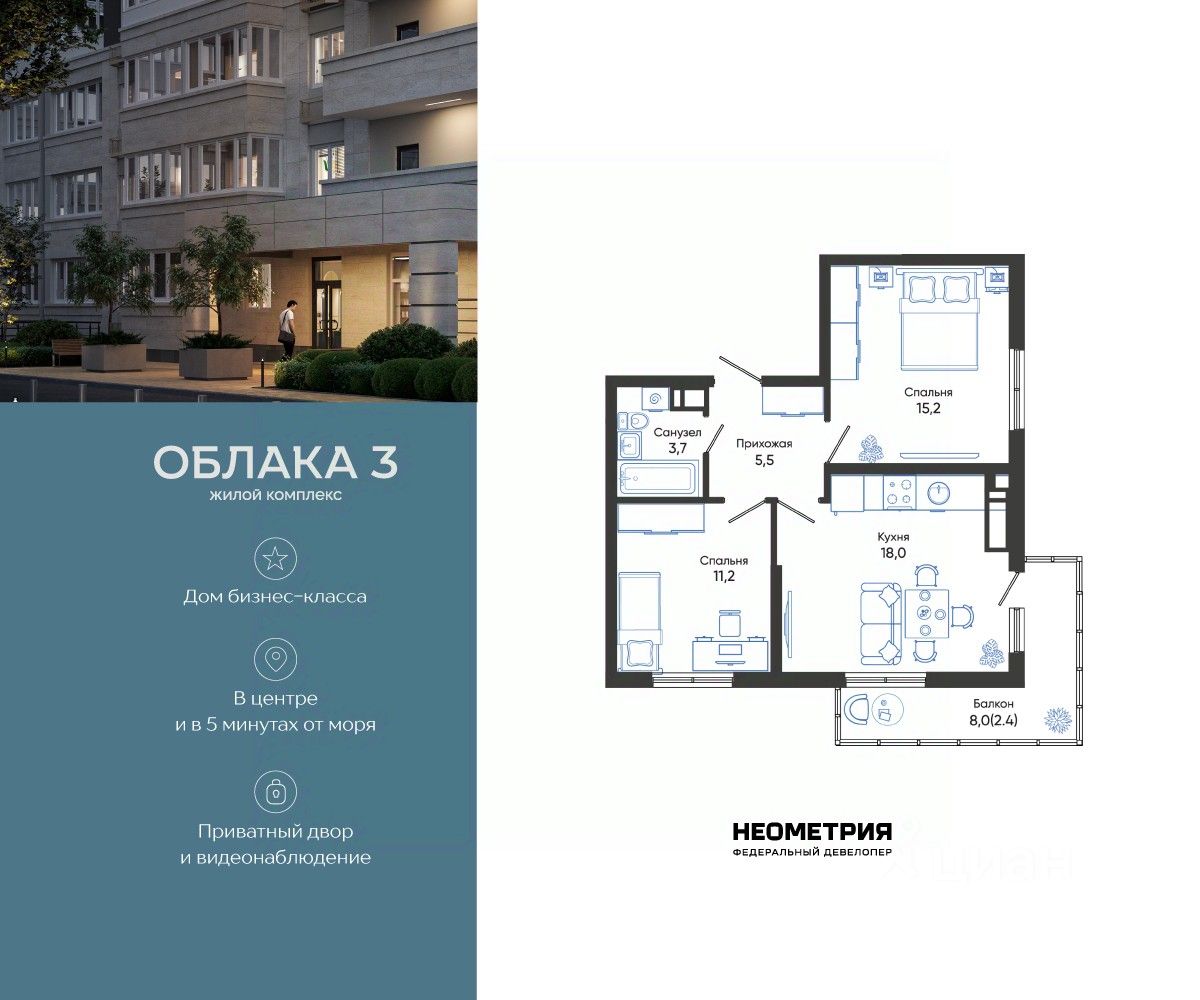 Продается квартира в жилом комплексе "Облака" от федерального девелопера "Неометрия".