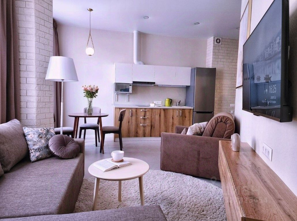Просторная кухня-гостиная: Идеальное место для семейных ужинов и встреч с друзьями, оснащена удобным диваном и большим телевизором.