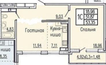 Гостиная 19 м² с двумя окнами и двумя изначальными проёмами от застройщика. Позволяет легко выделить отдельную кухню и спальню, превратив квартиру в полноценную двухкомнатную по вашему желанию.