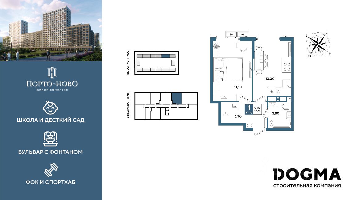 Срок сдачи: 4 кв. 2026, общей площадью 37.2 кв.м., на 14 этаже.