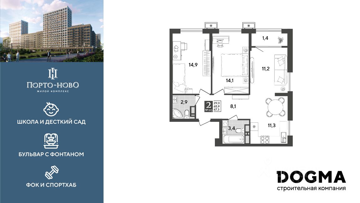 Срок сдачи: 4 кв. 2026, общей площадью 67.3 кв.м., на 17 этаже.