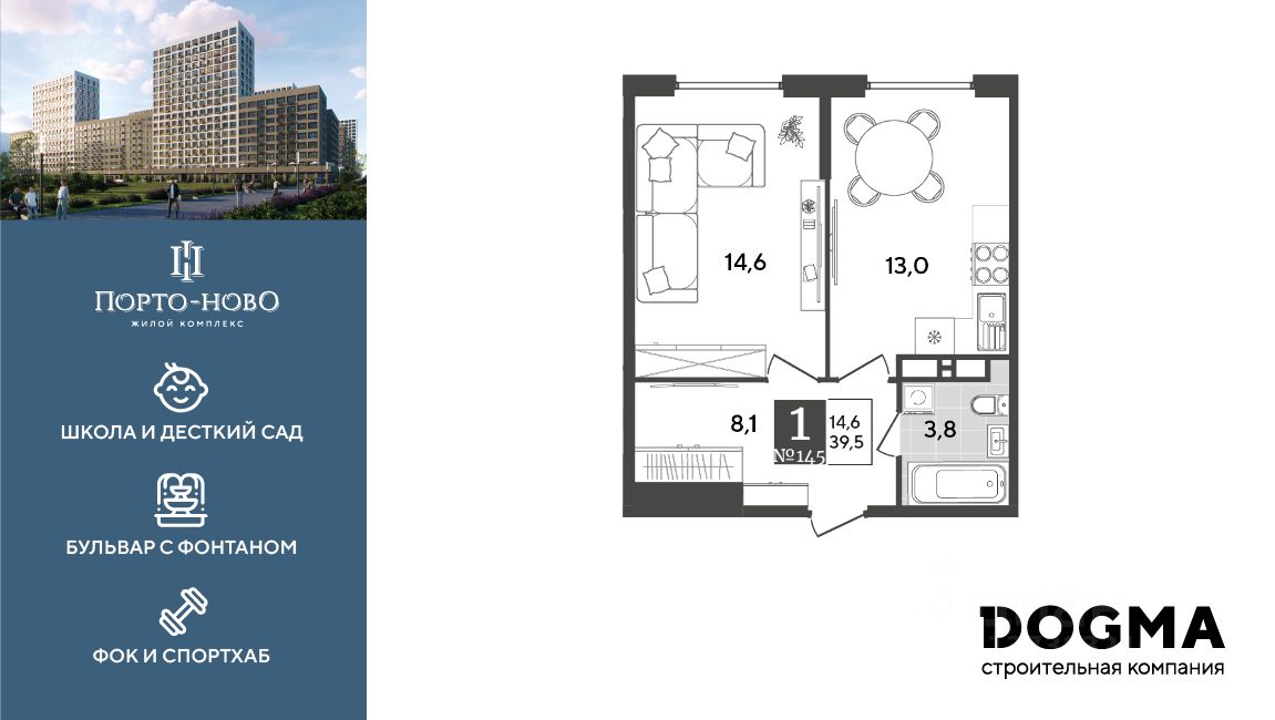 Срок сдачи: 4 кв. 2026, общей площадью 39.5 кв.м., на 13 этаже.