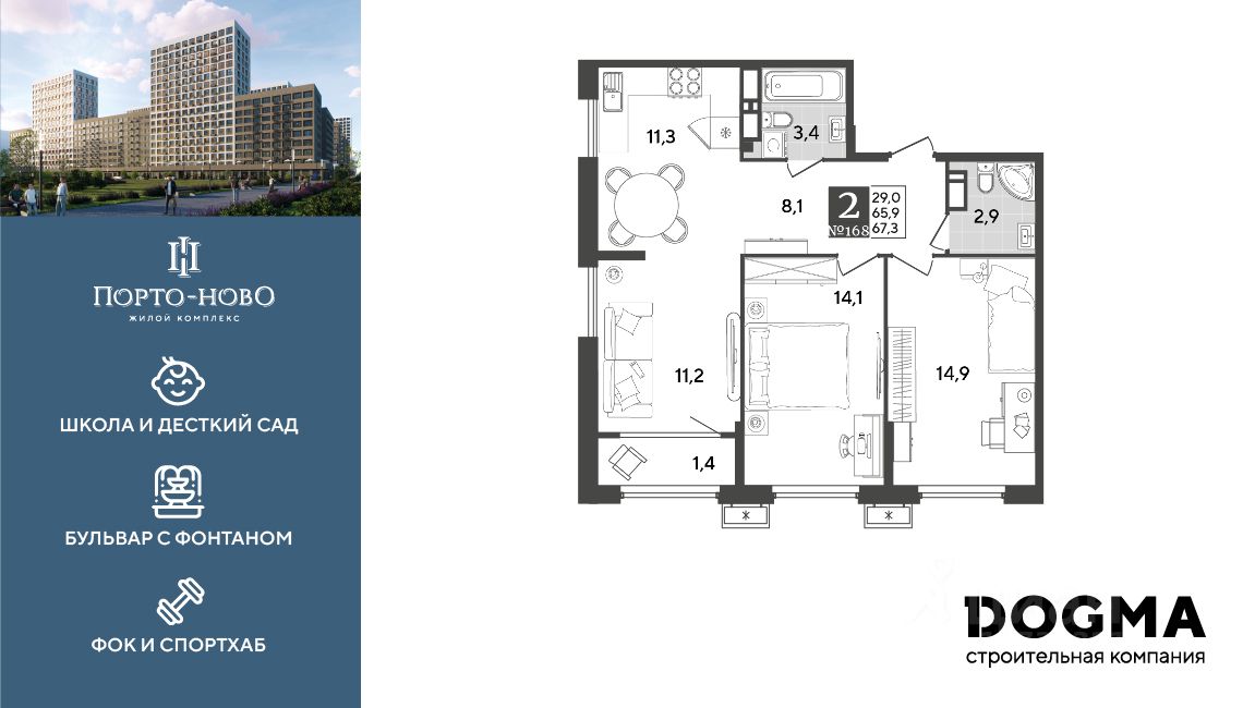 Срок сдачи: 4 кв. 2026, общей площадью 67.3 кв.м., на 16 этаже.