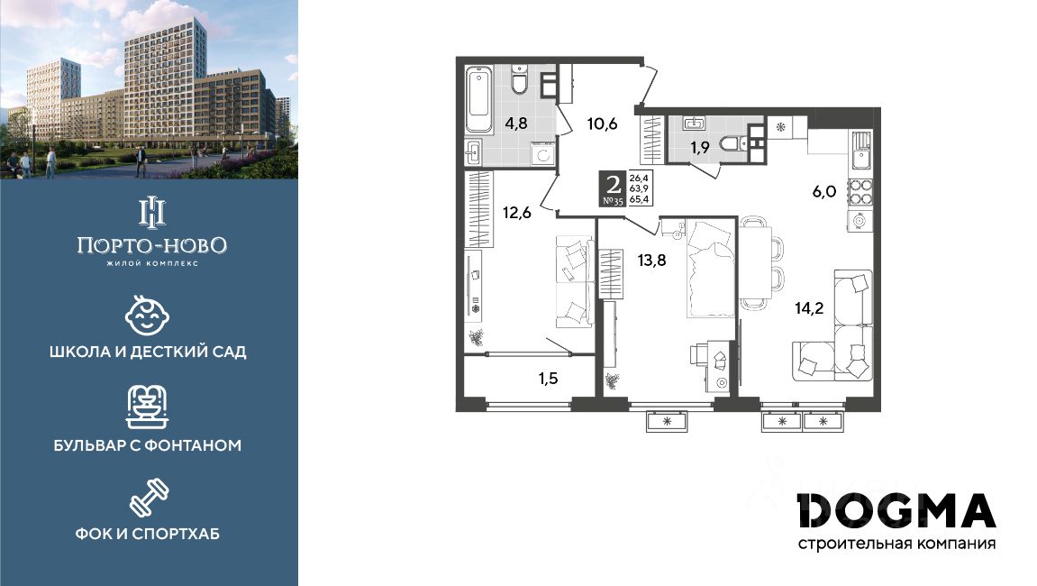Срок сдачи: 4 кв. 2026, общей площадью 65.4 кв.м., на 7 этаже.