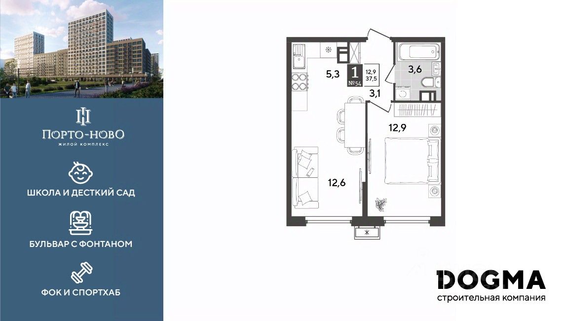 Срок сдачи: 4 кв. 2026, общей площадью 37.5 кв.м., на 7 этаже.