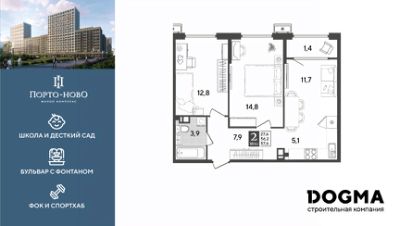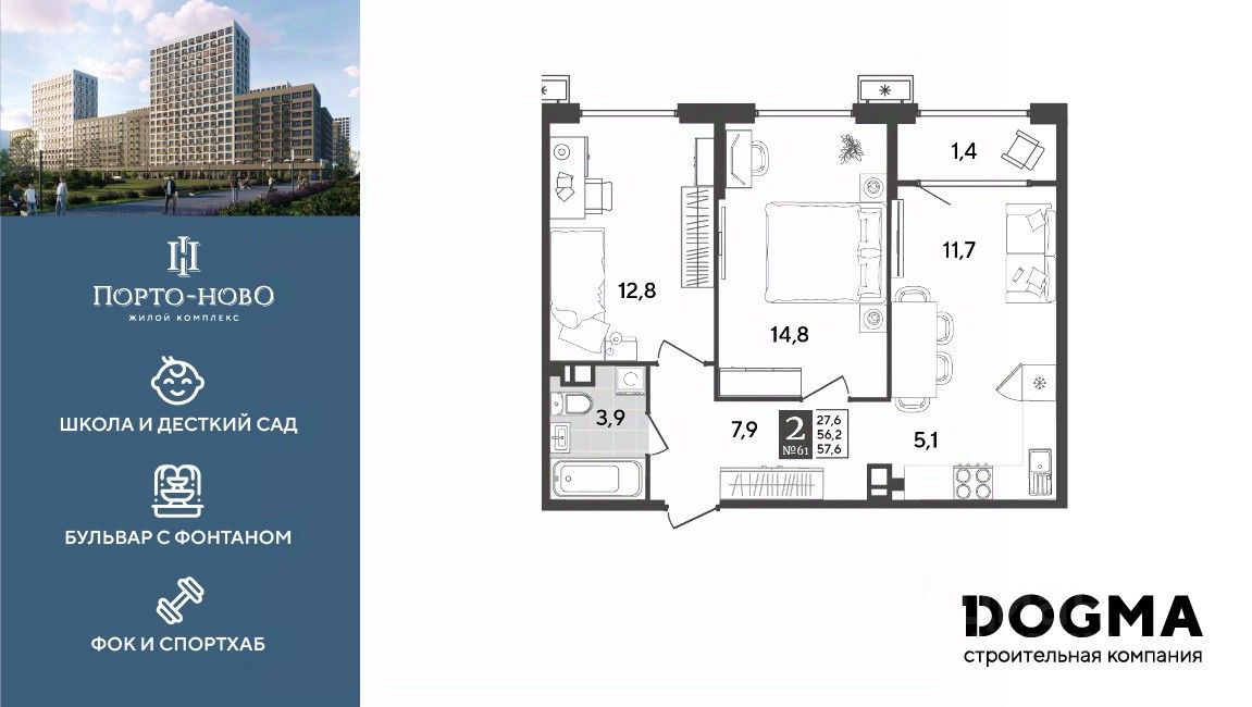 Срок сдачи: 4 кв. 2026, общей площадью 57.6 кв.м., на 8 этаже.