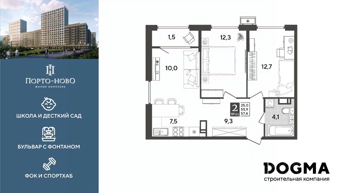 Срок сдачи: 4 кв. 2026, общей площадью 57.4 кв.м., на 12 этаже.