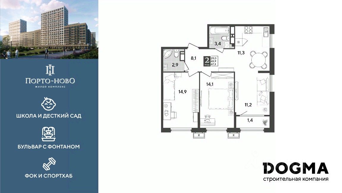 Срок сдачи: 4 кв. 2026, общей площадью 67.3 кв.м., на 16 этаже.