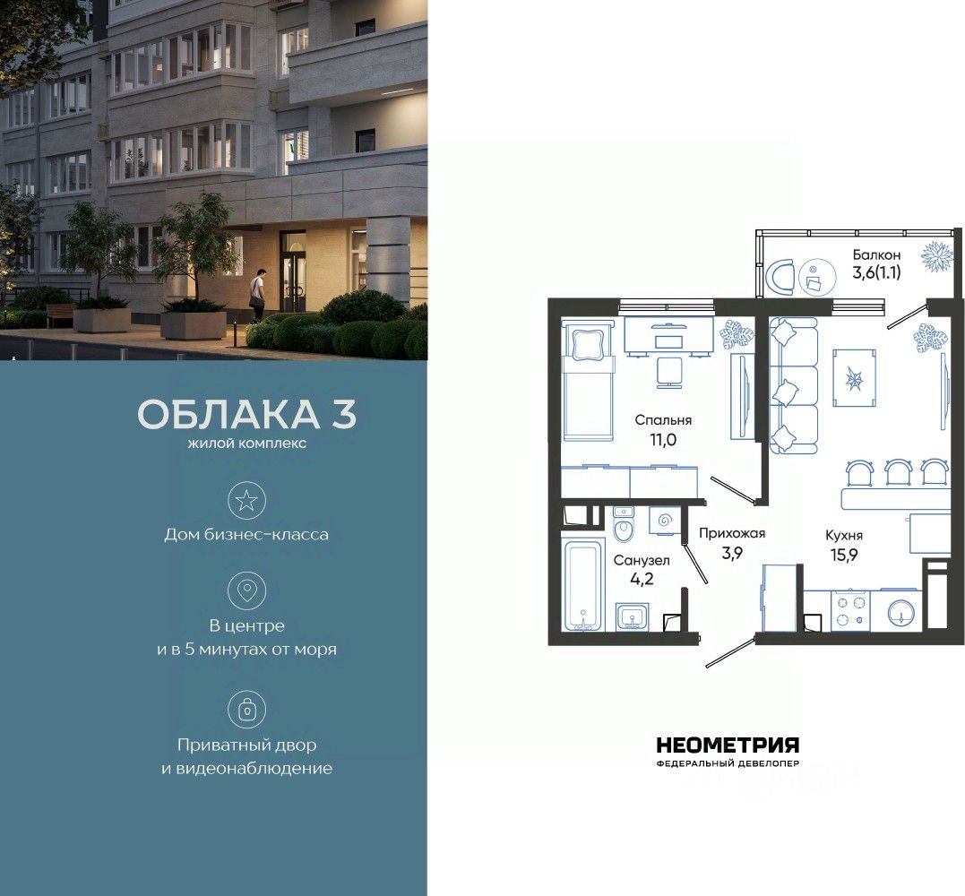 Продается квартира в жилом комплексе "Облака" от федерального девелопера "Неометрия".