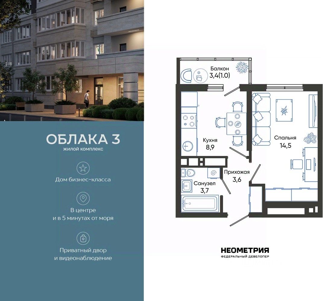 Продается квартира в жилом комплексе "Облака" от федерального девелопера "Неометрия".