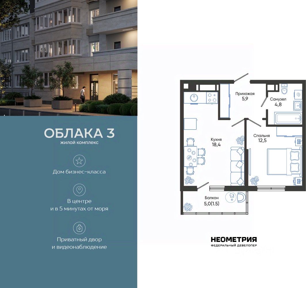 Продается квартира в жилом комплексе "Облака" от федерального девелопера "Неометрия".