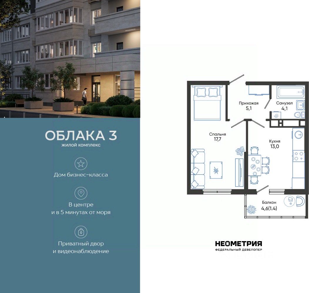 Продается квартира в жилом комплексе "Облака" от федерального девелопера "Неометрия".