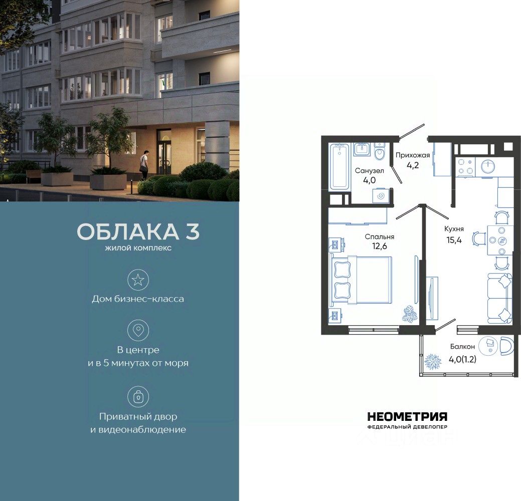 Продается квартира в жилом комплексе "Облака" от федерального девелопера "Неометрия".