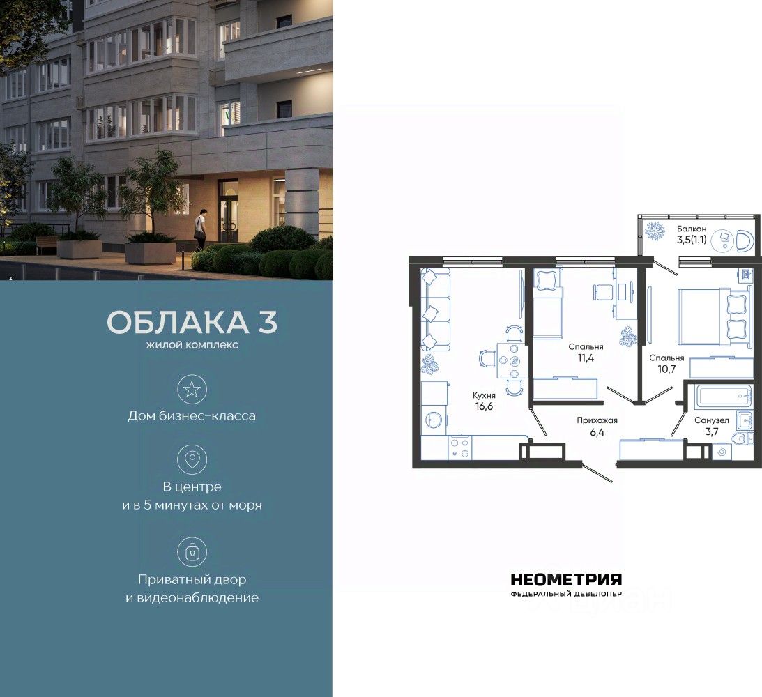 Продается квартира в жилом комплексе "Облака" от федерального девелопера "Неометрия".