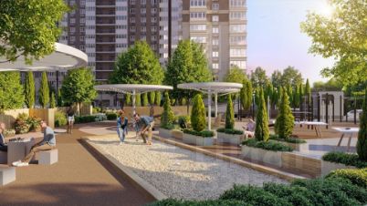 Во дворах реализована концепция "активити-парка" — это большое зелёное пространство для отдыха и занятий спортом: