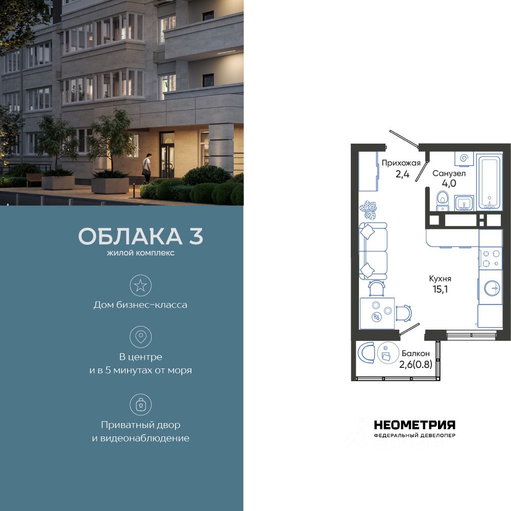 Продается квартира в жилом комплексе "Облака" от федерального девелопера "Неометрия".