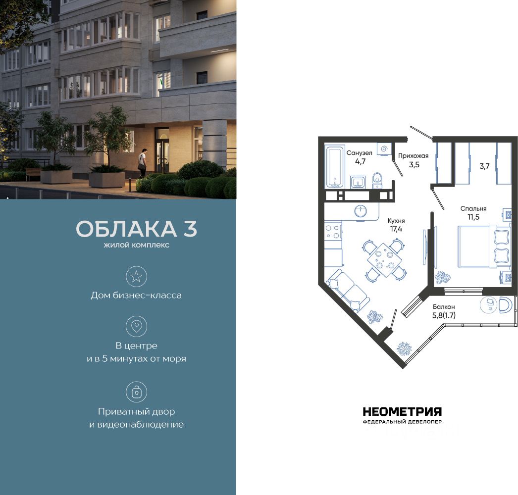 Продается квартира в жилом комплексе "Облака" от федерального девелопера "Неометрия".