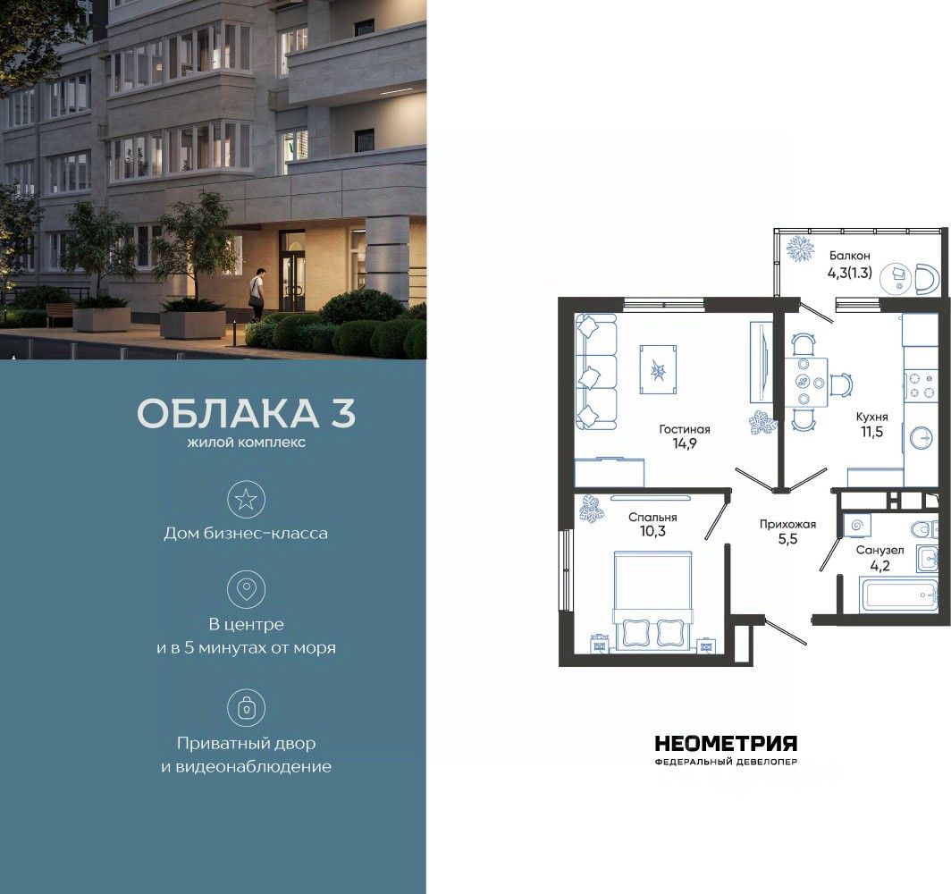 Продается квартира в жилом комплексе "Облака" от федерального девелопера "Неометрия".