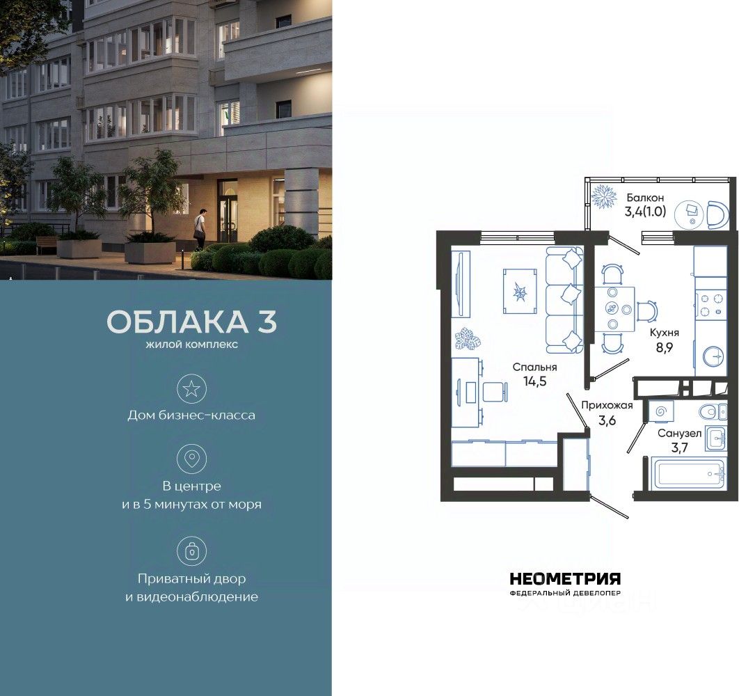 Продается квартира в жилом комплексе "Облака" от федерального девелопера "Неометрия".