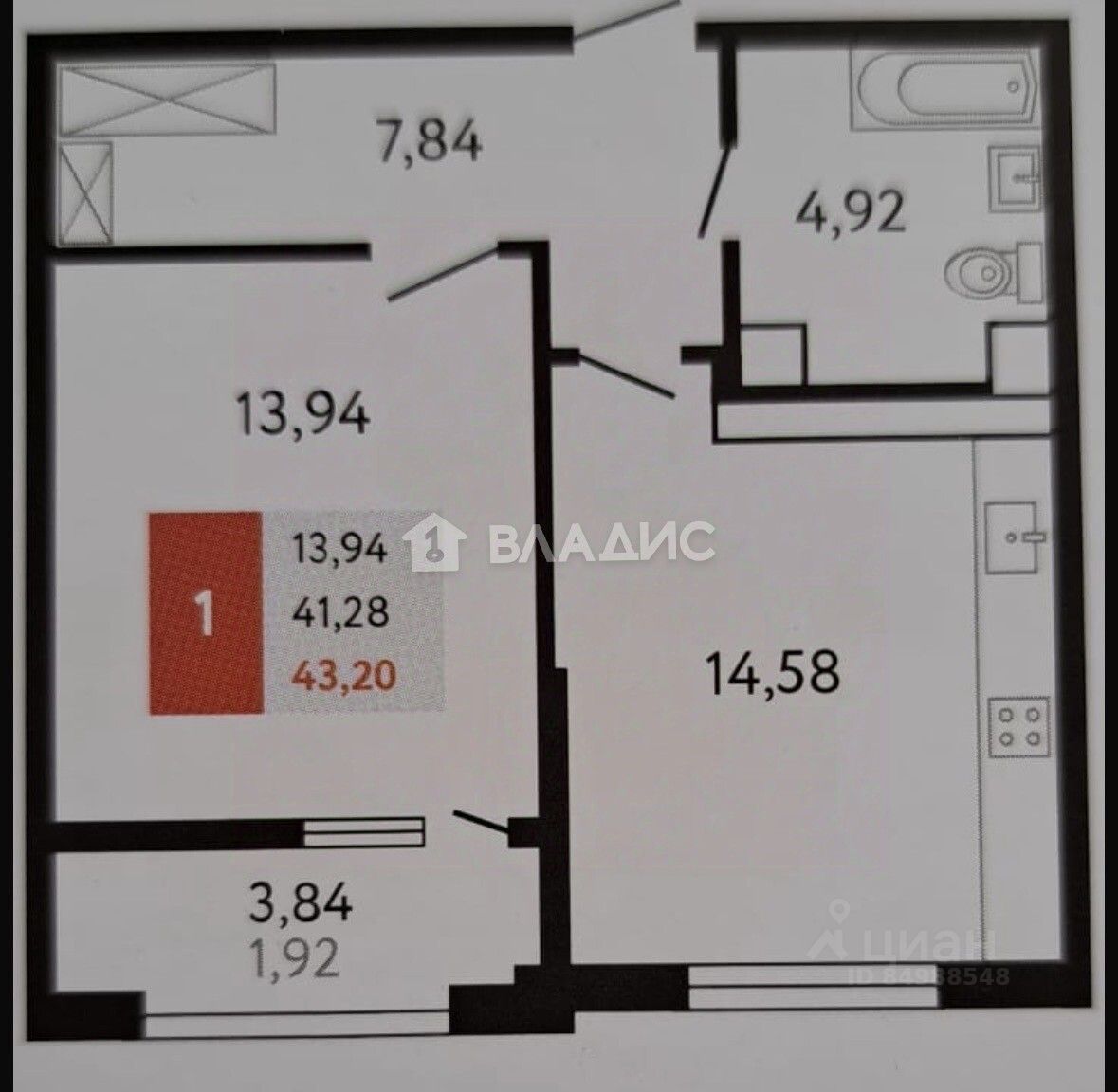 Общая площадь - 43,2 кв.м